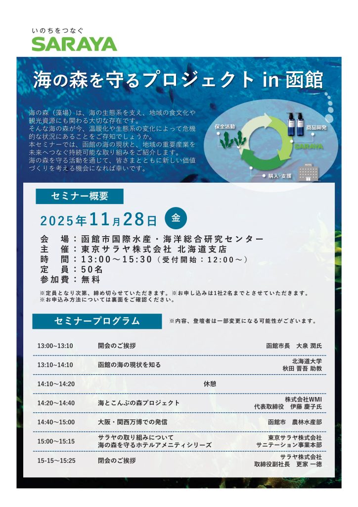 この度、同社北海道支店が主催の「海の森を守るプロジェクトin函館」と題したセミナーが函館市国際水産・海洋総合研究センターにおいて開催されることになりましたので、お知らせいたします。