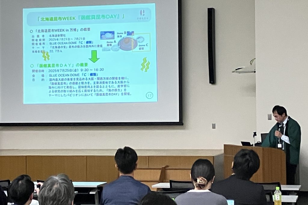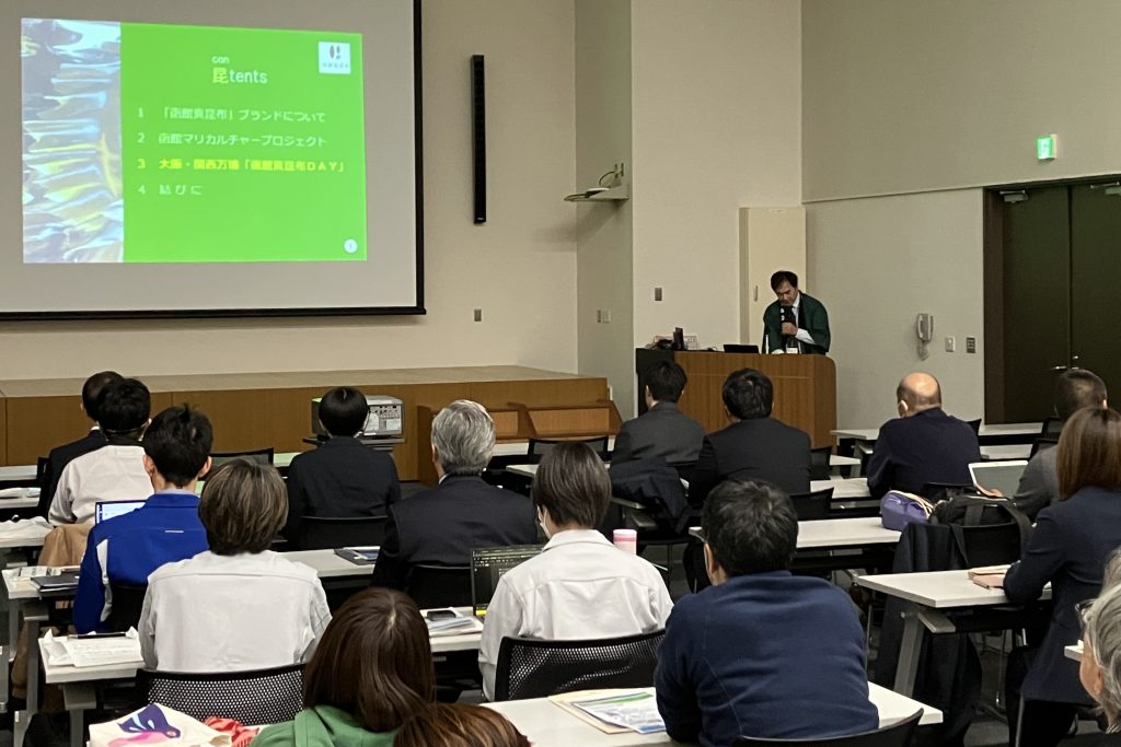 このセミナーでは、本プロジェクト・マーケティング部会から函館市農林水産部市場・販路担当の佐々木課長が登壇し、「『函館真昆布』ブランド」「函館マリカルチャープロジェクト・マーケティング部会の取り組み」「大阪・関西万博『函館真昆布DAY』」などについて説明するとともに、「函館真昆布」の法被を纏ってセミナー参加者に「函館真昆布」をPRしました。