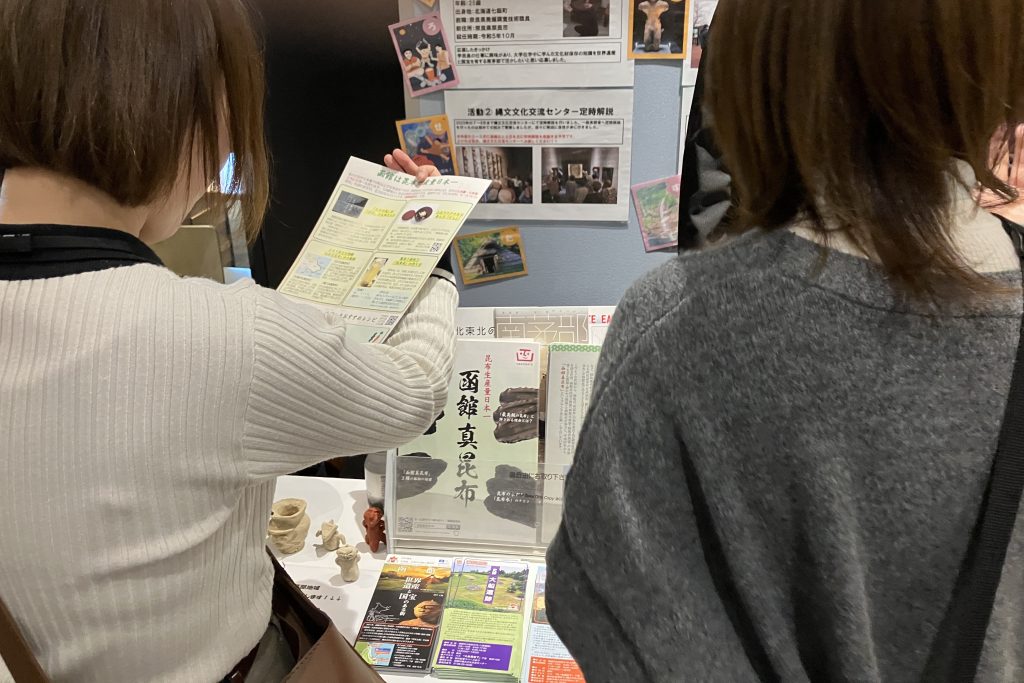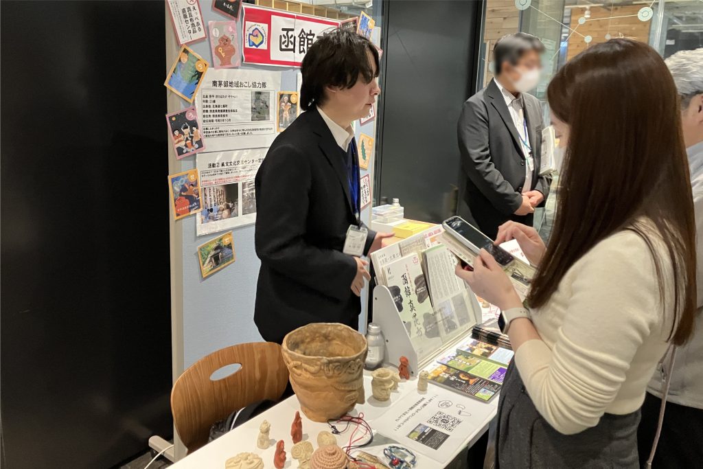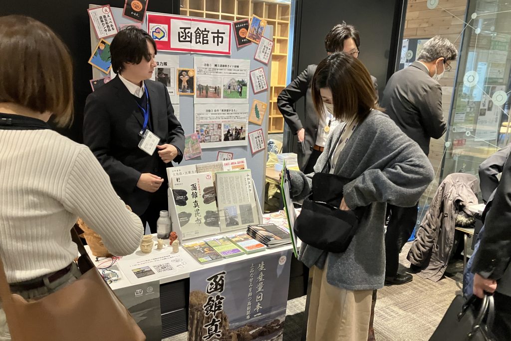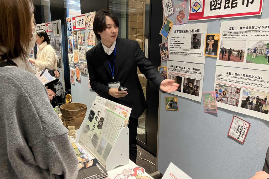 ブースプレゼンテーションでは、函館市をはじめ8つのブースが設けられ、函館市のブースでは、函館市南茅部支所・地域おこし協力隊の北畠宗平さんが南茅部地区での「縄文世界遺産」に関わる活動や自作の「南茅部かるた」、「函館真昆布」などについて説明していました。